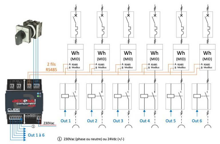 Il est composé d’un composant ACCESS 1 OUT ou 6 OUT, associé à un compteur (MID), monophasé ou triphasé et d’un organe de coupure (contacteur ou bobine MN/MX).