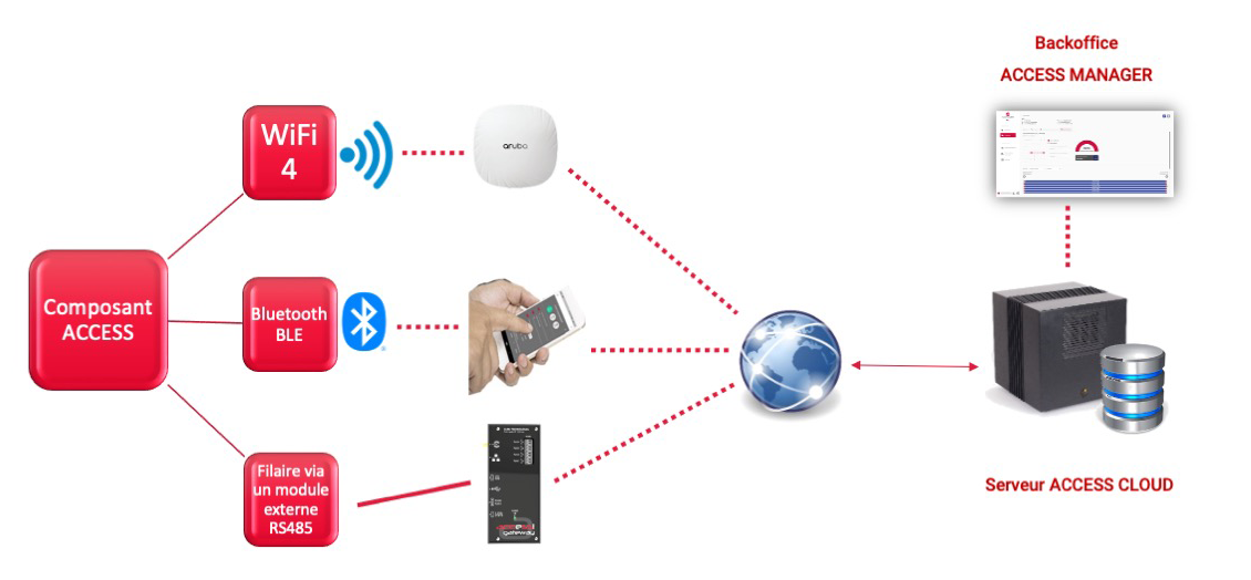 Le Composant ACCESS peut se connecter sur une infrastructure WiFi de site en WiFi 4 (2,4Ghz/WPA2). La communication avec le serveur ACCESS Cloud est à l’initiative du Composant ACCESS :