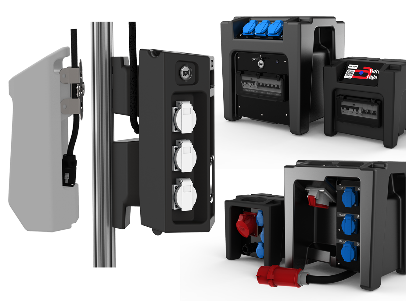 Les accessoires SPLITTER et QUADRUPLETTE sont des boitiers de dérivation qui remplacent le ‘mistigri’ ! Un SPLITTER, alimenté en 32A triphasé peut distribuer du courant monophasé pour six coffrets COMPACT.