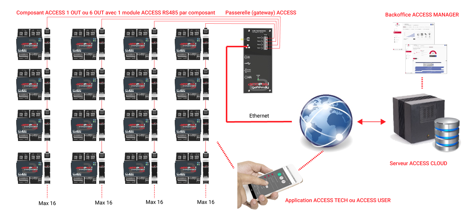 Trois modes de communication entre les composants ACCESS et le serveur ACCESS, hébergé dans la Cloud permettent de déployer la solution ACCESS selon l’infrastructures de communication et de distribution électrique de chaque site.