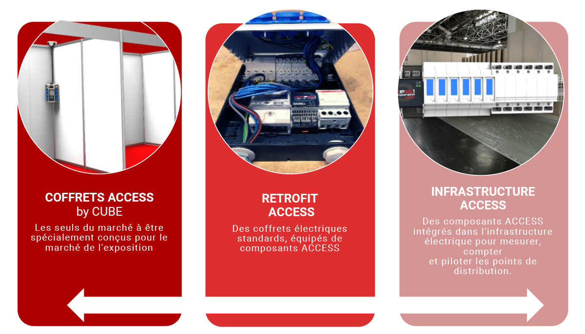 ACCESS permet aux électriciens et gestionnaires de palais des congrès et parcs d’expositions de simplifier la mise en œuvre, d’accroitre la qualité de service et d’optimiser l’offre commerciale proposée aux exposants.