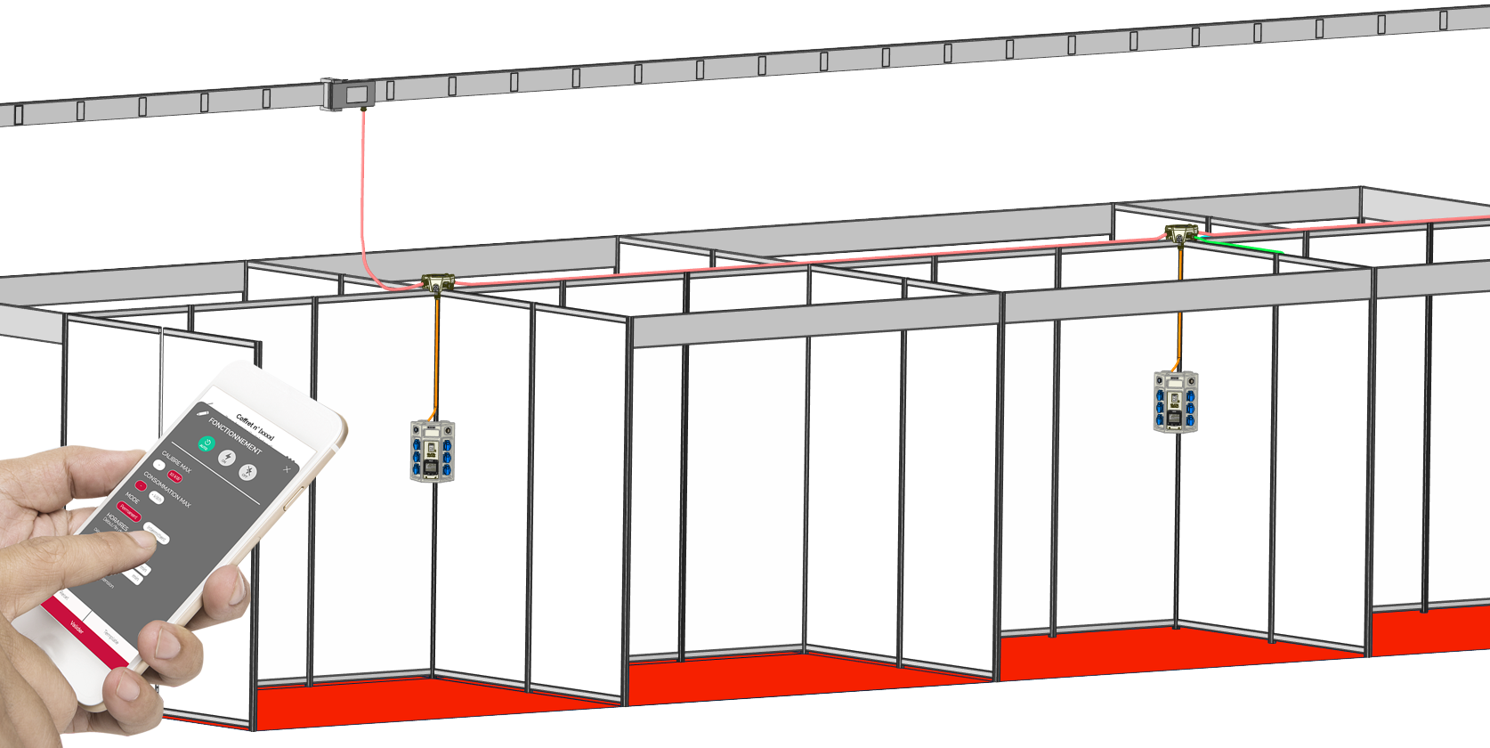 Idéalement les SPLITTERS et QUADRUPLETTES se positionnent en hauteur, emboités sur le poteau d’angle des stands construits en structure d’aluminium.