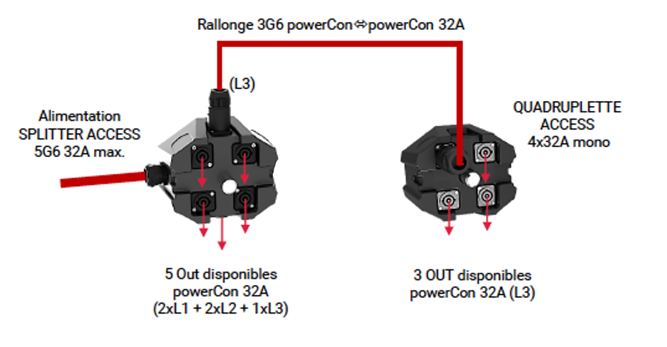 La connexion de la QUADRUPLETTE s’effectue par une rallonge powerCon32A/powerCon32A entre l’une des prises du SPLITTER ACCESS et l’une des prises de la QUADRUPLETTE